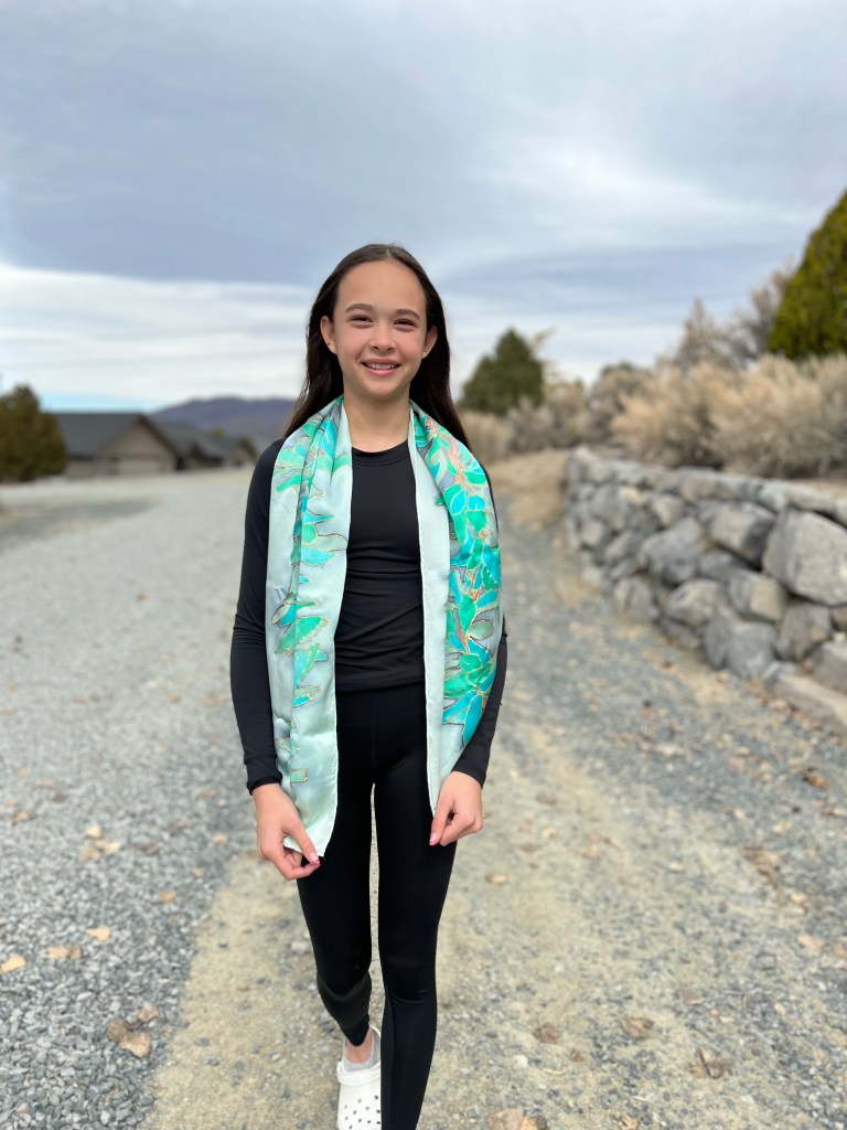 Each 100% China silk scarf is individually hand-painted in my home studio that leads to our make-shift storage room next to our garage.